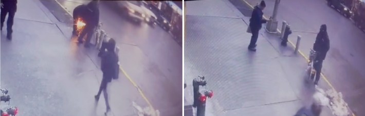 Surveillance footage obtained by Streetsblog’s Max White show the workers first cutting the bike’s chain from a pole (left) and then one worker taking a picture of the other as the bike was junked.