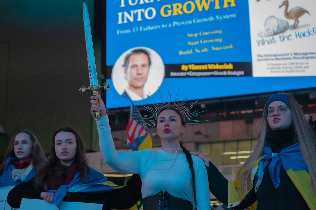 At the same time, non-profit Svitanok hosted a four-hour-long protest in Father Duffy Square, with each hour beginning with a moment of silence.