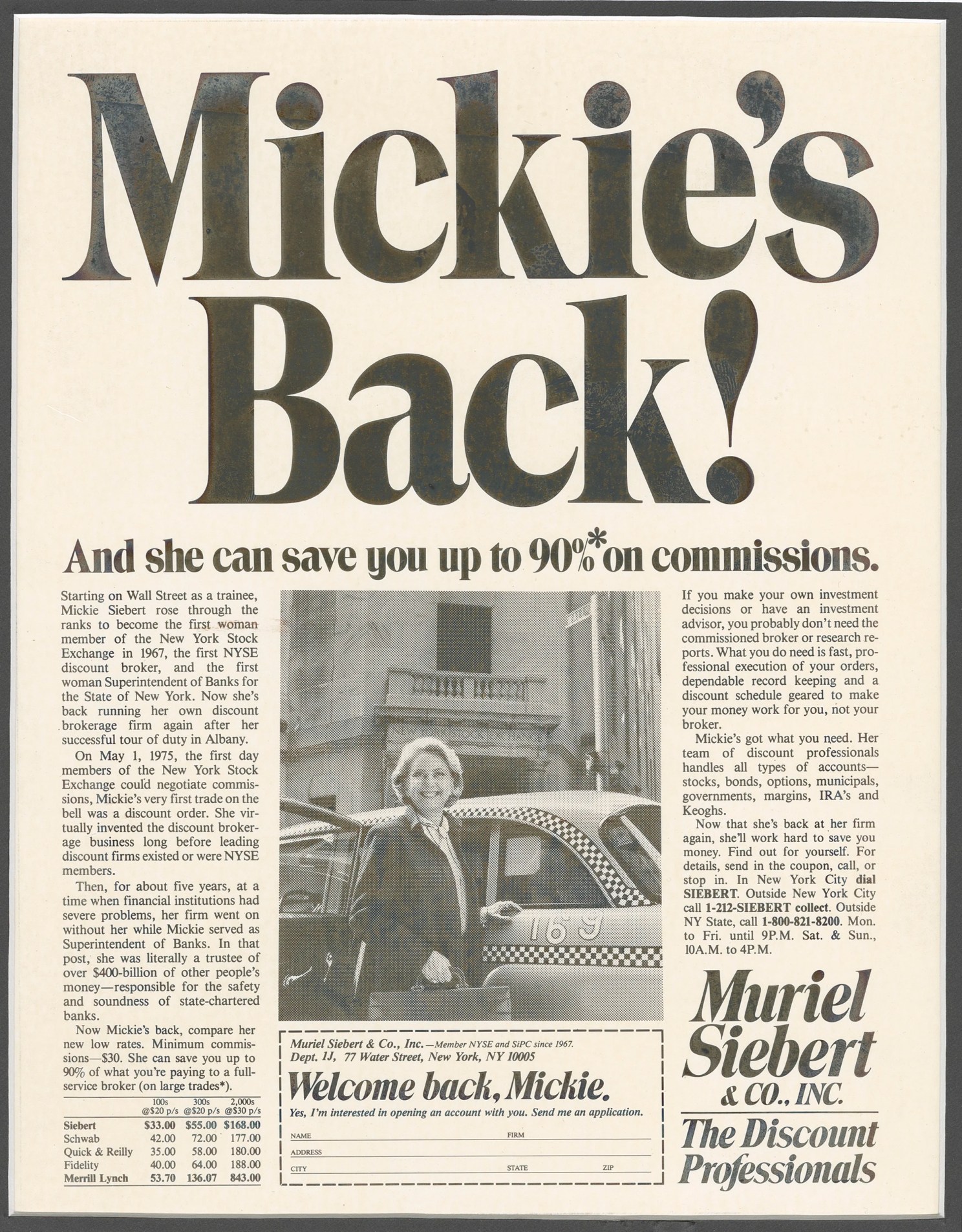 “Mickie’s Back!” Advertisement, 1983, Muriel Siebert & Co.