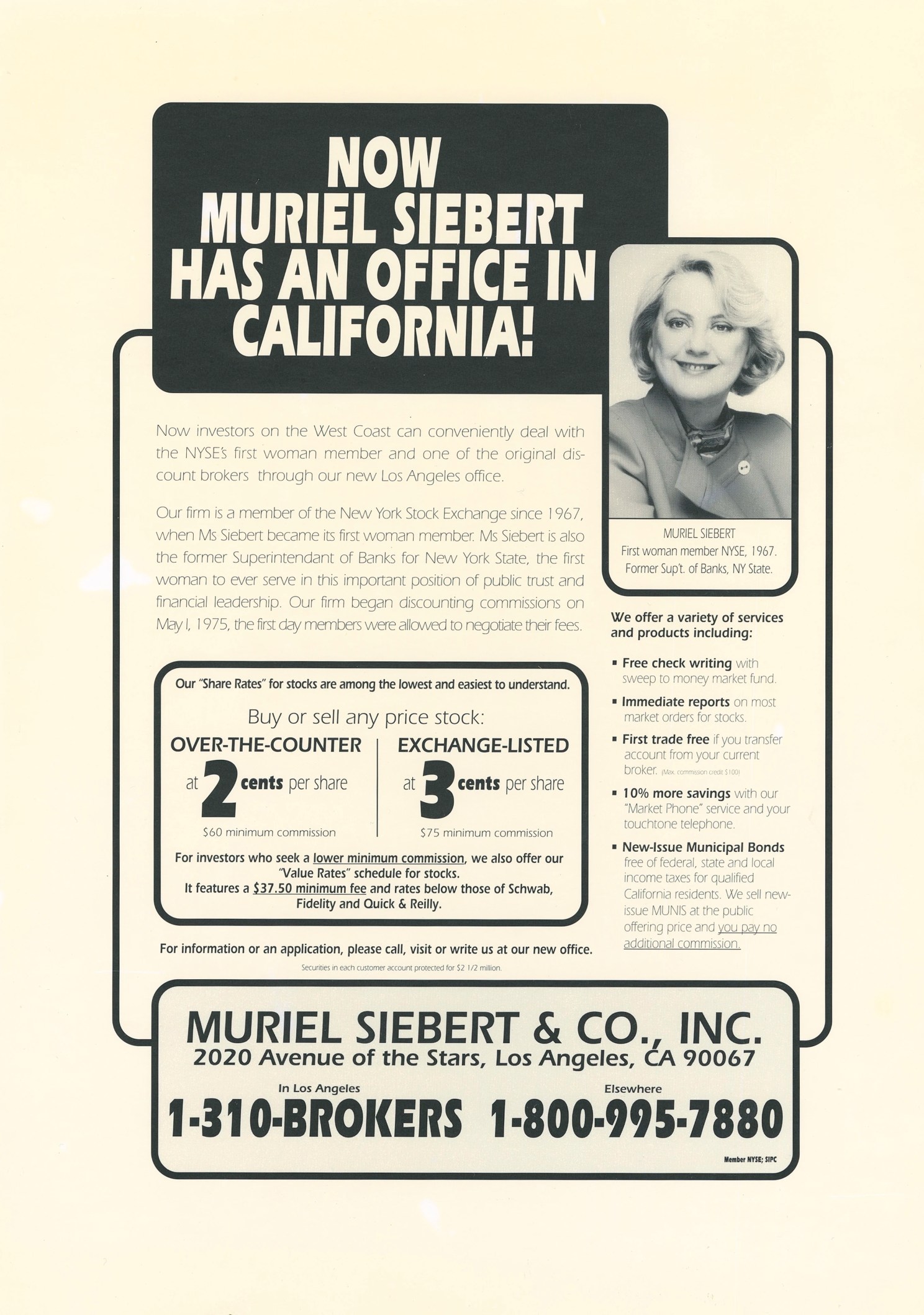 “Now Muriel Siebert has an office in California!” Advertisement.