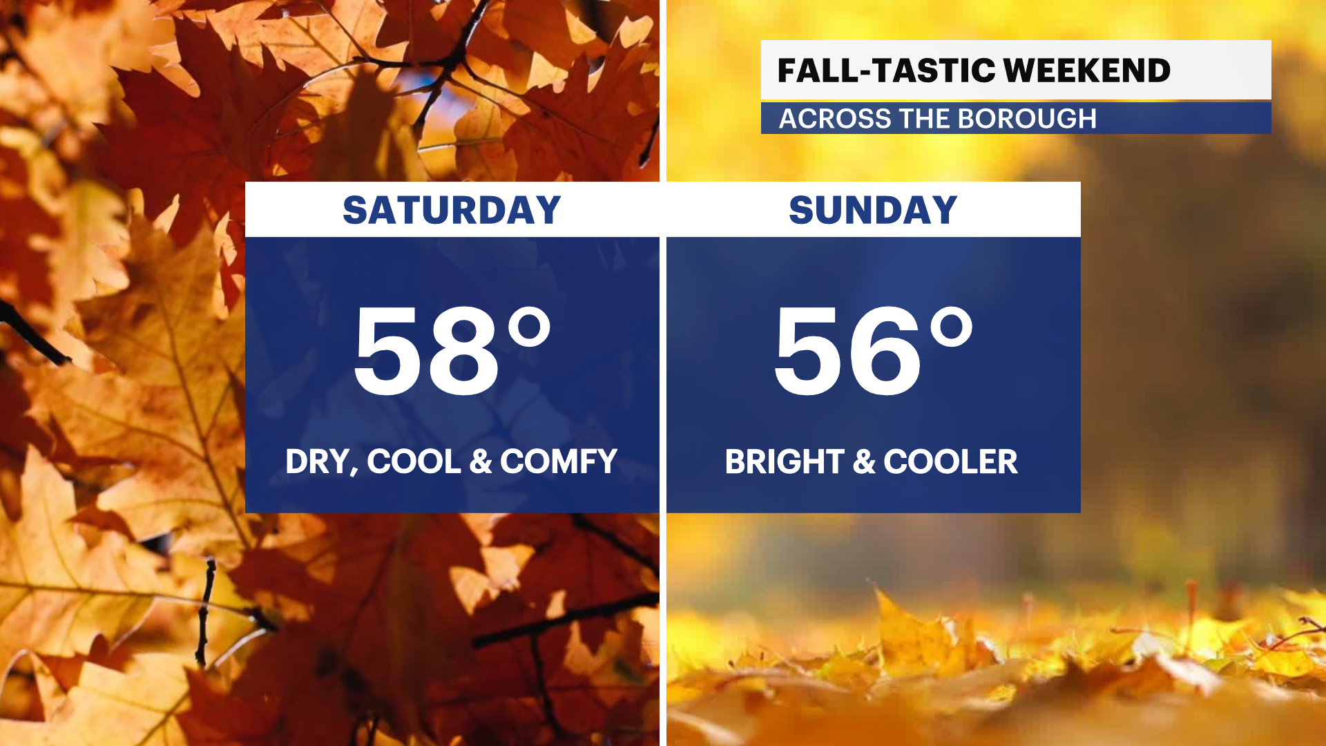 Saturday: Mostly sunny, below seasonable but still nice. Highs near 58. Lows near 45.