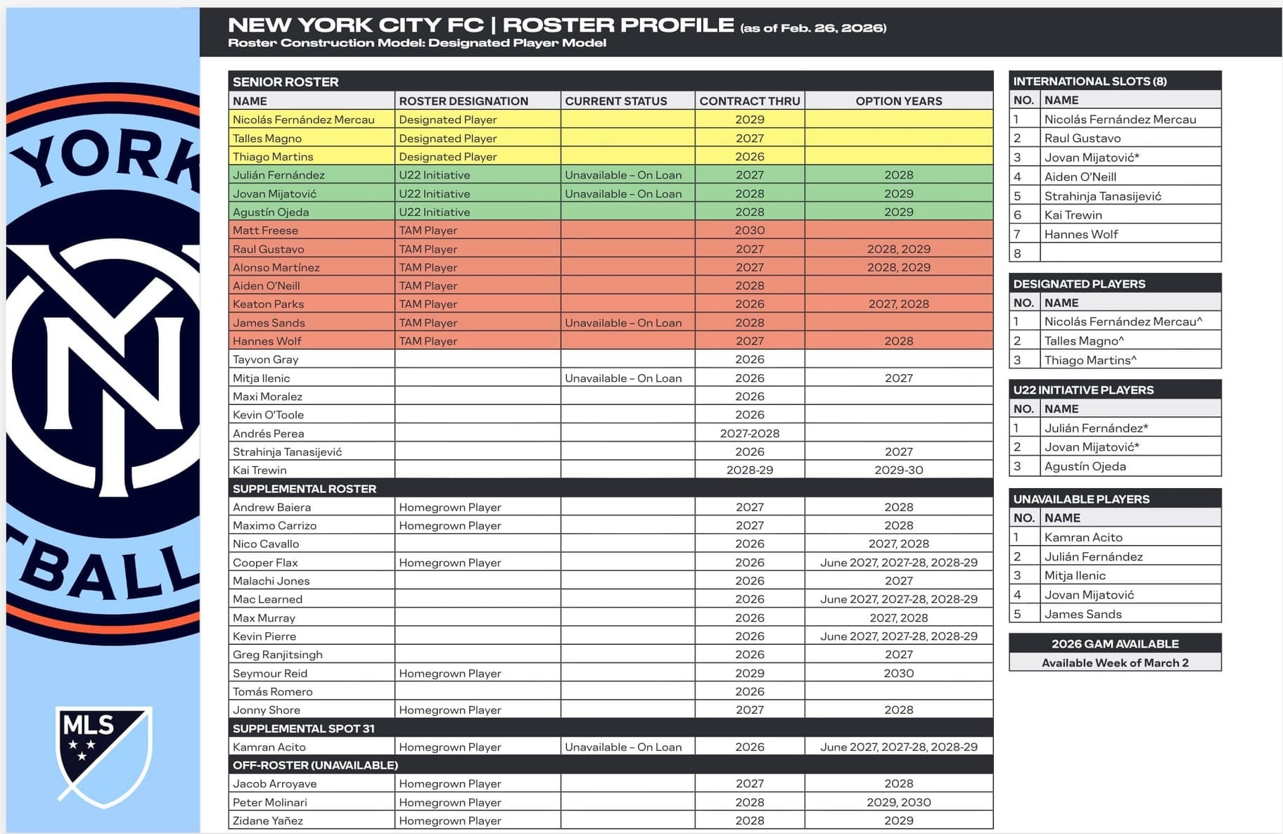 Significant things have changed since the last NYCFC Club Roster Profile update shared by MLS back in September 2025. In the previous version of this handy roster graphic, the club was following an entirely different roster construction path and had more open, unoccupied premium roster spots to play with.