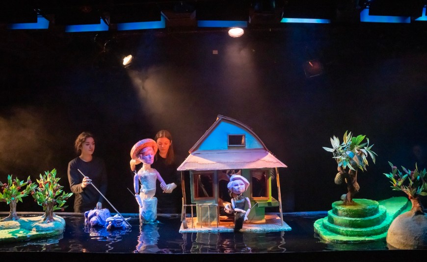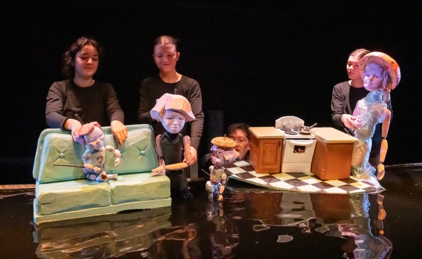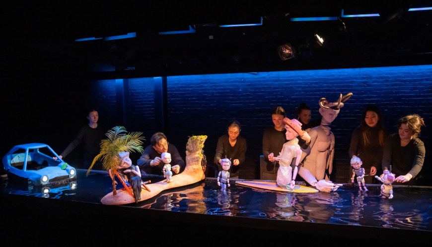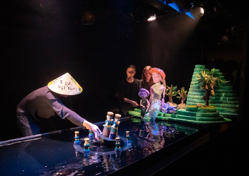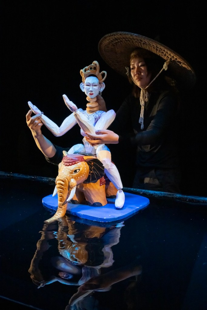 This elaborate, tuneful puppet musical doesn’t just tell the story of the journey of Kim Pham from Vietnamese “hometown girl” riding a water buffalo to young romantic in Saigon to war refugee “boatperson” to mother of four sons in Houston, Texas. It threads the tale with Vietnamese history and mythology, populates it with elephants, lions, dragons and demons, presents it as shadow puppetry and a contemporary downtown spin on traditional Vietnamese water puppetry (complete with a stage-wide pool of water), and accompanies it with sixteen songs from rock to pop to country – all in 60 minutes. It’s a lot to take in: clever and colorful, but also crowded and confusing.
