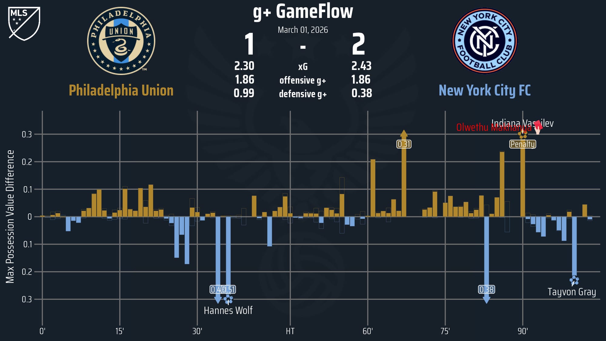 In New York City FC’s return to the site of their emphatic 2025 Eastern Conference Semi-Final win during last season’s MLS Cup Playoffs, goals from Hannes Wolf and Tayvon Gray gave the Pigeons a dramatic 2-1 win over the Philadelphia Union Sunday afternoon at Subaru Park.