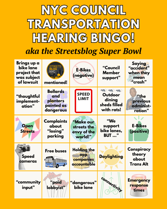 Like we said, the Super Bowl of Council meetings. Transportation Alternatives is holding a rally in advance of the hearing in support of full implementation of the Streets Master Plan, the construction of more public space, the wider use of city power under the so-called “Sammy’s Law” to lower speed limits to 20 miles per hour, and other items seen in Ben Furnas’s tweet below: