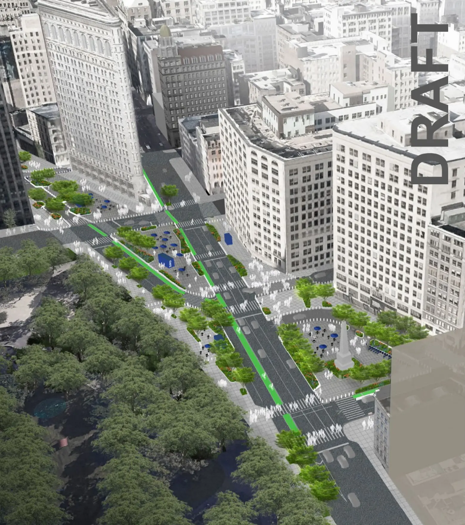 Draft renderings of the project were unveiled at the community board meeting as part of a presentation focused on an application to expand the maintenance and concession agreement with the Flatiron NoMad Partnership, the area’s business improvement district, as reported by Streetsblog.