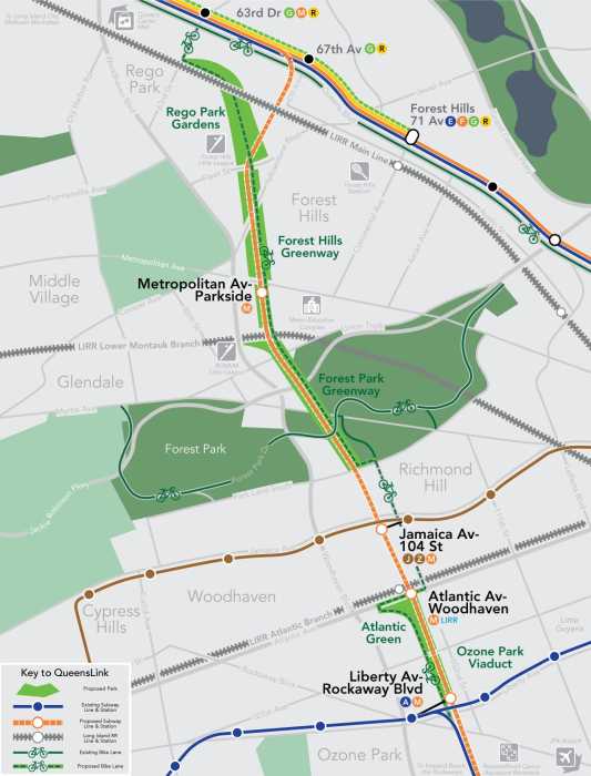 The plan also requires the Department of Small Business Services (DSBS) and Empire State Development (ESD) to provide targeted storefront improvement grants, anti-vacancy incentives, and small business incubator funding dedicated to Atlantic Avenue. But the heart of the plan lies in the remodeling of the Woodhaven LIRR subway stop, which connects to the Q11, Q24 and QM15 buses, as well as the proposed QueensLink line.