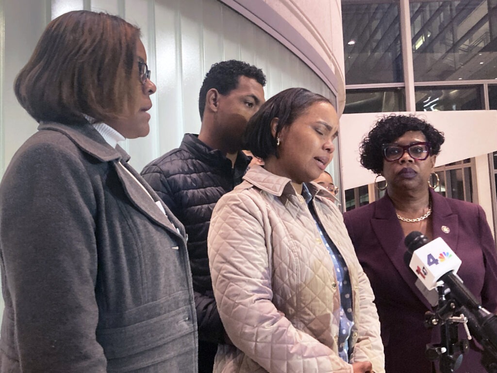 ASSISTANT DISTRICT ATTORNEY Karl Miller (second from left) from the Office of the Bronx District Attorney joins the parents of the late Nicholas Feliz Dominici, 1, Otoniel Feliz Samboy and Zoila Dominici, as they address the media, together with Bronx District Attorney Darcel Clark and others at Bronx Criminal Court on Friday, Nov. 21, 2025, after Grei Mendez, the former manager of now-closed El Divino Niño daycare center, located on Morris Avenue in Kingsbridge Heights, The Bronx, who had previously been found guilty in federal court and had been sentenced to 45 years for charges arising from the accidental death of Nicholas from a fentanyl overdose on Sept. 15, 2023, was also found guilty by unanimous verdict by a jury on two separate New York State charges.