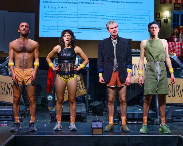The concept is radical enough on paper, but in practice it is utter pandemonium: Strom beseeches an audience member to shoot a cutout duck with a nerf gun as Weintraub valiantly attempts to change from his running shorts into a speedo without flashing the audience. Meanwhile, Bird crowdsources ideas for an emergency arts grant while Williams attempts to fill a large pot with water (to boil the pasta). Their treadmills never stop moving.