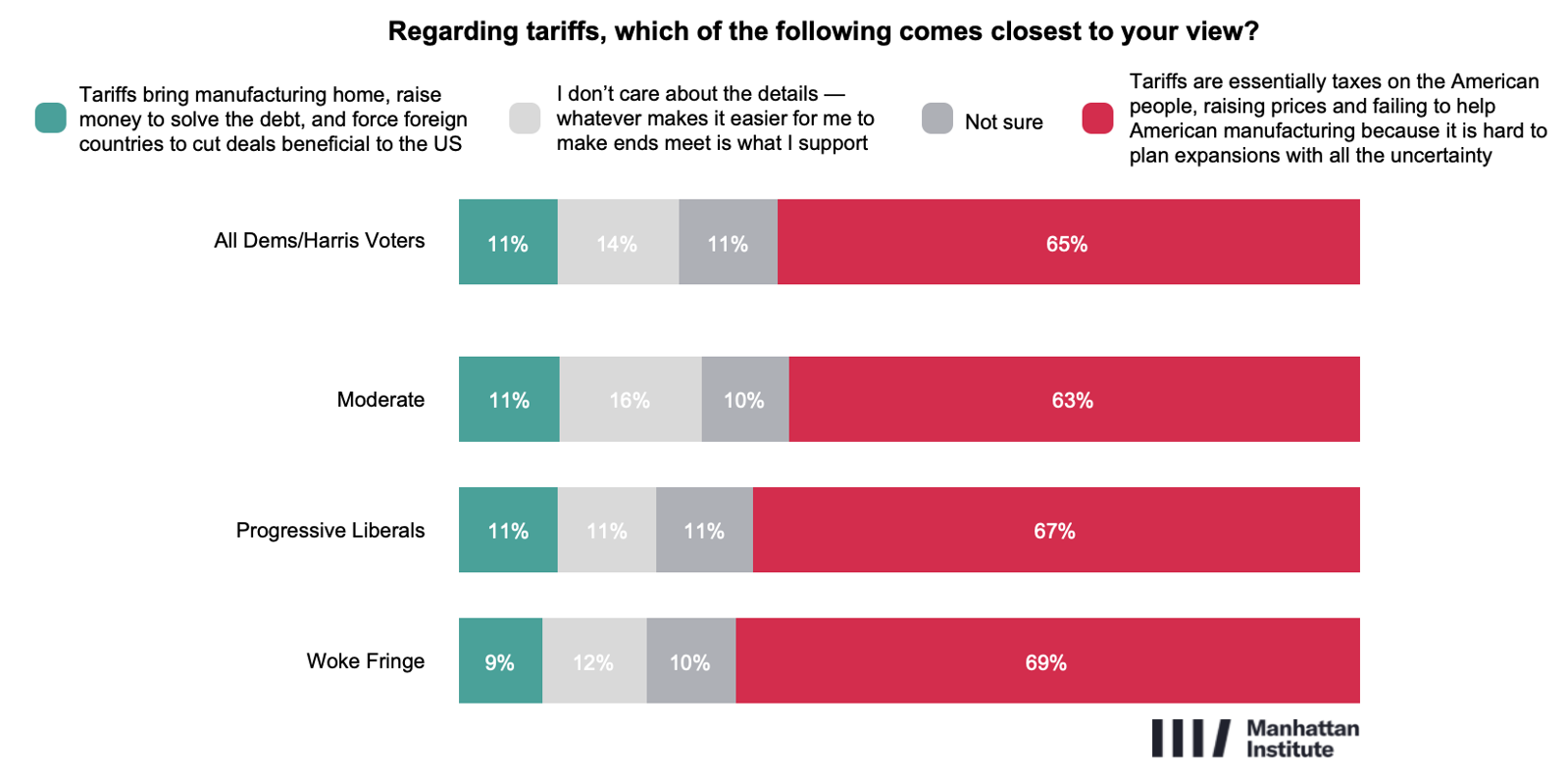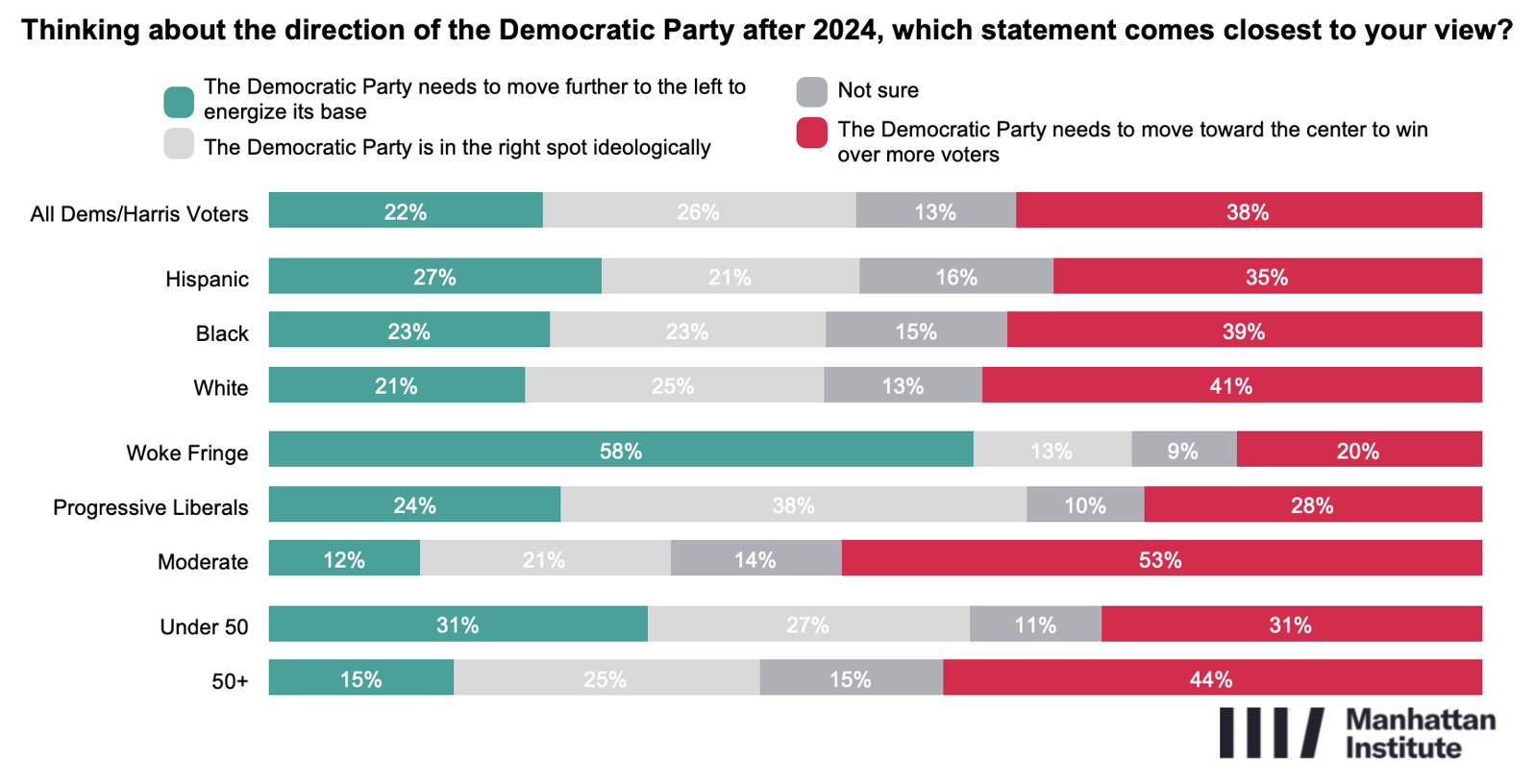 A new national survey conducted by the Manhattan Institute examines today’s Democratic coalition and the tensions shaping the party ahead of the 2026 midterm and 2028 presidential election cycles. The poll reached 2,593 respondents who are either registered Democrats and/or voted for Kamala Harris in 2024. The survey also includes oversamples of Hispanic and black voters who meet that criteria.