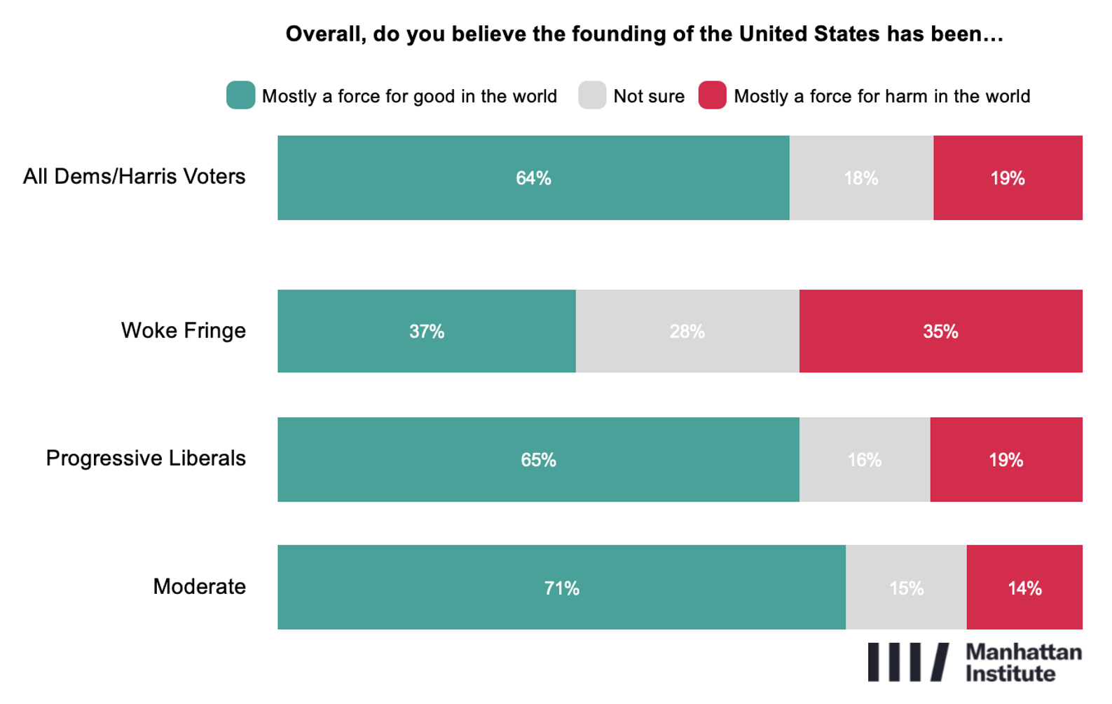 Despite pessimism about racial progress, the Democratic coalition retains broadly positive views of the country’s historical legacy. Nearly two-thirds (64%) say the founding of the U.S. has been mostly a force for good in the world, compared with 19% who view it as mostly harmful. This view is strongest among Moderates (71%) and Progressive Liberals (65%). The Woke Fringe again stands apart, with just 37% saying the founding was mostly a force for good and 35% saying it was mostly a force for harm.