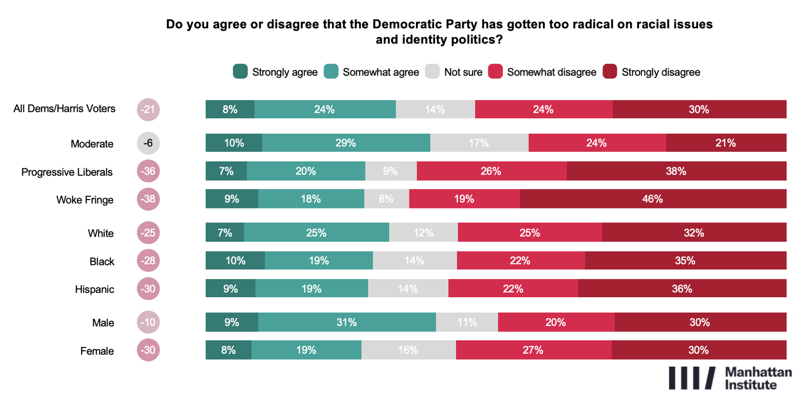 When asked directly whether the Democratic Party has become too radical on racial issues and identity politics, a majority of the Democratic coalition disagrees (54%), while roughly one-third (33%) agrees. Concern is most pronounced among Moderates, nearly four in ten of whom say the party has gone too far, whereas Progressive Liberals and the Woke Fringe are less likely to share that view.