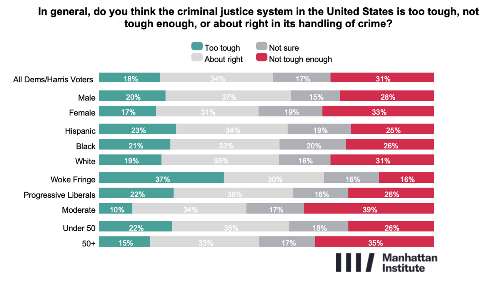 Factional differences are pronounced. Moderates are the most enforcement-oriented, with a 39% plurality saying the system is not tough enough. Progressive Liberals cluster around the middle, with a 36% plurality describing the system as about right. The Woke Fringe stands apart, with a 37% plurality saying the criminal justice system is too tough.