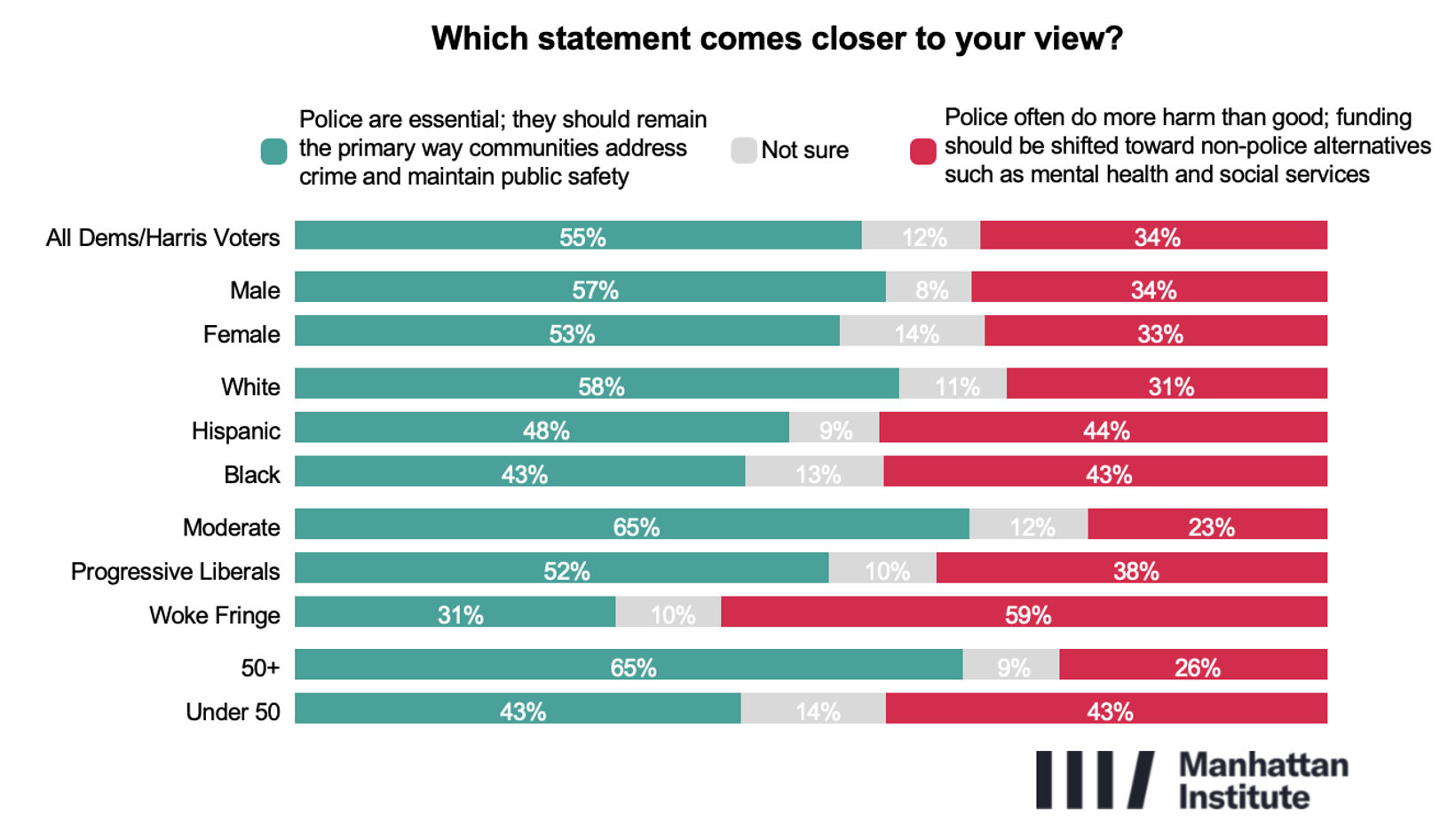 Between February 6 and 15, 2026, the Manhattan Institute surveyed three separate national audiences: 1,782 registered Democrats and/or 2024 Harris voters, 828 black Democrats and/or 2024 Harris voters, and 388 Hispanic Democratic and/or 2024 Harris voters. The sample was reached via online panels (1,968 interviews) and SMS-to-web (625 interviews).