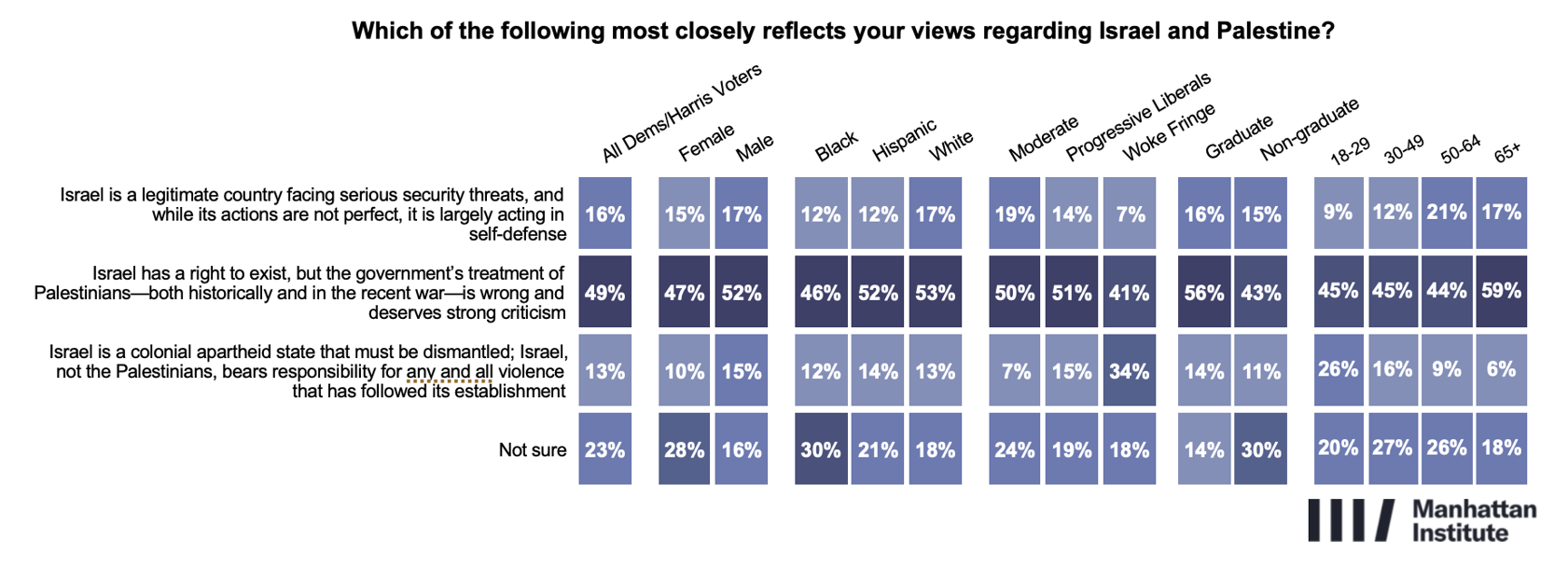 Views on Israel and Palestine within today’s Democratic coalition are more nuanced than often assumed. Only 13% believe that Israel is a colonial apartheid state that must be dismantled and that Israel, not the Palestinians, bears responsibility for any and all violence that has followed its establishment. At the other end, only 16% are willing to say that Israel is a legitimate country facing serious security threats, and that while its actions are not perfect, it is largely acting in self-defense.