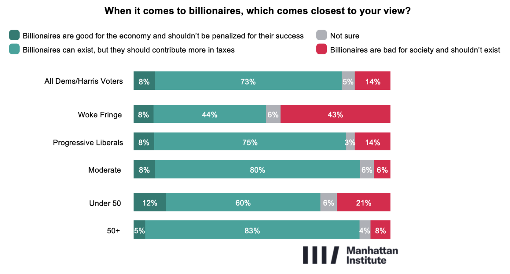 Few in the Democratic coalition embrace the leftist mantra that “every billionaire is a policy failure.” Only 14% say that billionaires are bad for society and should not exist—and only 15% believe that America’s economic and social system is so rigged it ought to be burnt down, without concern for the powerful losing their money or jobs. By contrast, 78% say that the system should either be preserved (“America’s system works well overall, so when we change things, we should do so carefully and gradually”) or reformed (“America’s system isn’t perfect, but we should fix what’s broken and protect what works”). Anti-system sentiment is more pronounced among younger voters and the Woke Fringe—28% of those aged 18–29 and 43% of the Woke Fringe say billionaires should not exist—but these views remain minority positions across the coalition.