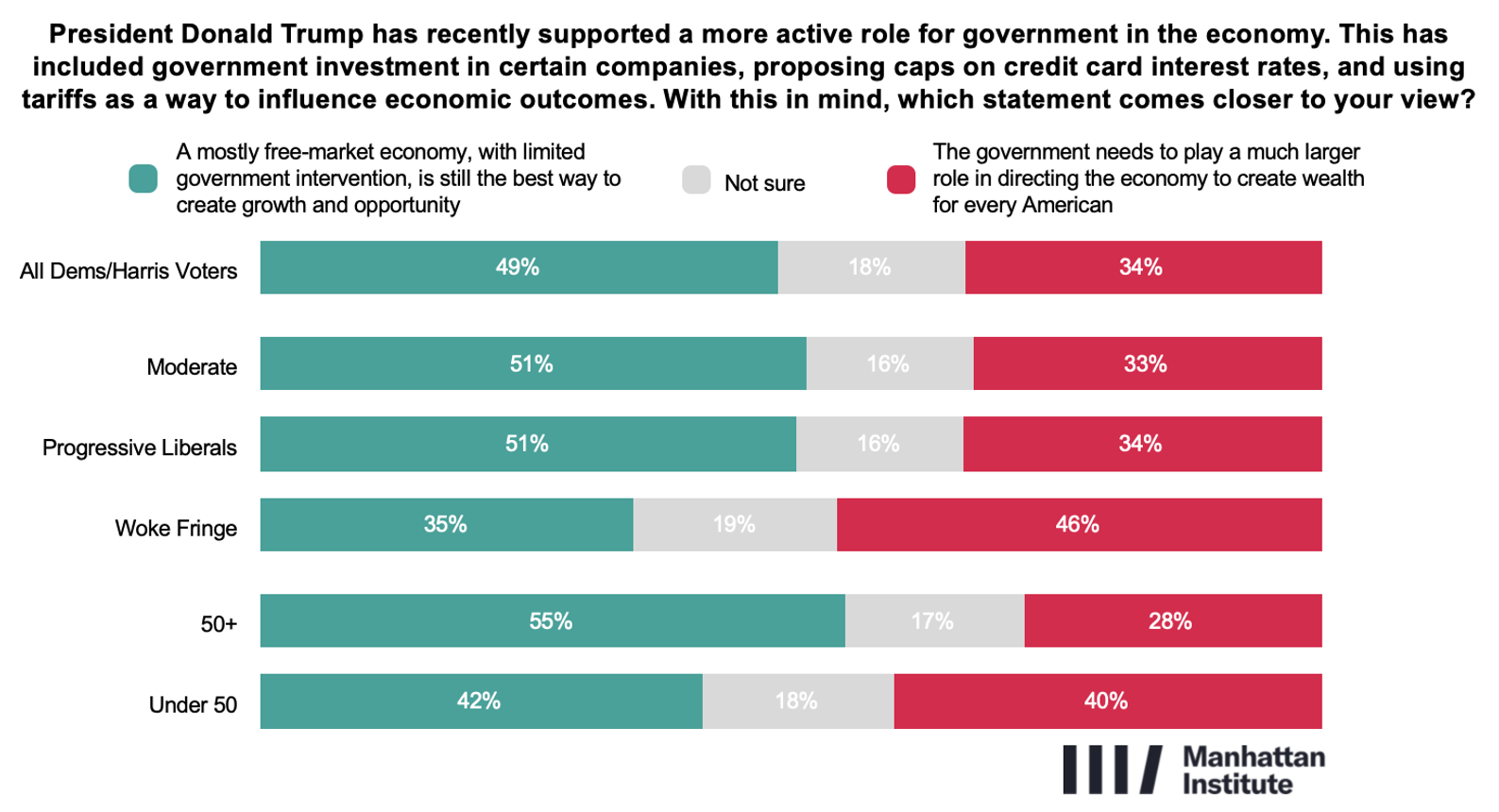 When President Trump’s economic approach is explicitly referenced, attitudes within the Democratic coalition shift modestly toward market-friendly language. Presented with a choice between a mostly free-market economy and a larger government role in directing economic activity, a plurality (49%) select the free-market option, compared with 34% who favor greater intervention, while 18% remain unsure. Given broader support seen in this survey for targeted government actions, such as price controls and interest rate caps, this likely reflects anti-Trump sentiment and context-dependent views rather than a clear ideological shift toward laissez-faire economics.