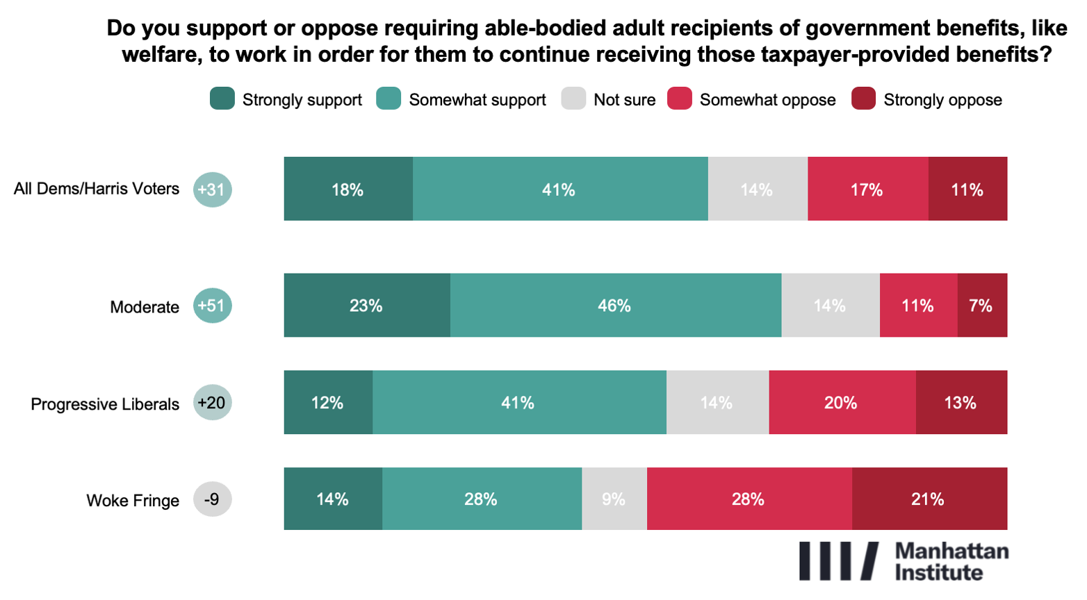 Requiring work in exchange for government benefits like welfare is also widely popular, earning 58% support among today’s Democrats. Moderates and Progressive Liberals are overwhelmingly supportive, while nearly half (50%) of the Woke Fringe oppose such requirements. Hispanic (59%) and black voters (58%) are also supportive of work requirements.