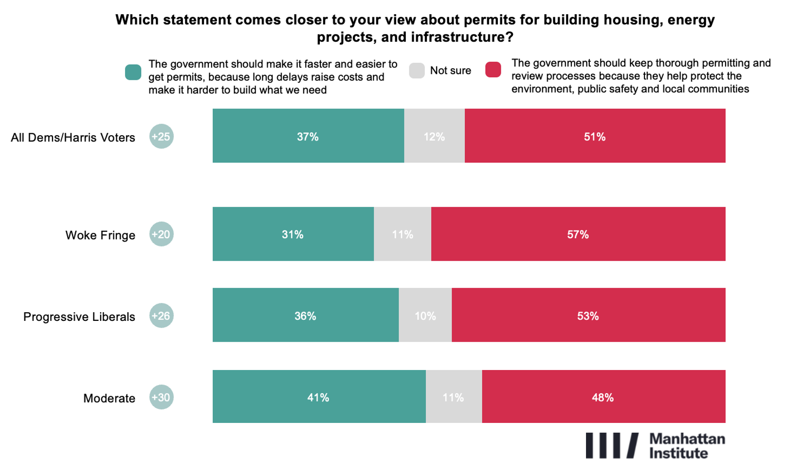 However, when voters are asked specifically about permitting for housing, energy, and infrastructure projects, caution again prevails. A majority (51%) say that the government should maintain thorough permitting and review processes to protect environmental quality, safety, and local communities, while 37% favor faster and simpler permitting to reduce delays and costs. Majorities of Progressive Liberals (53%) and the Woke Fringe (57%) strongly support tight permitting requirements, as do a plurality of Moderates (48%).