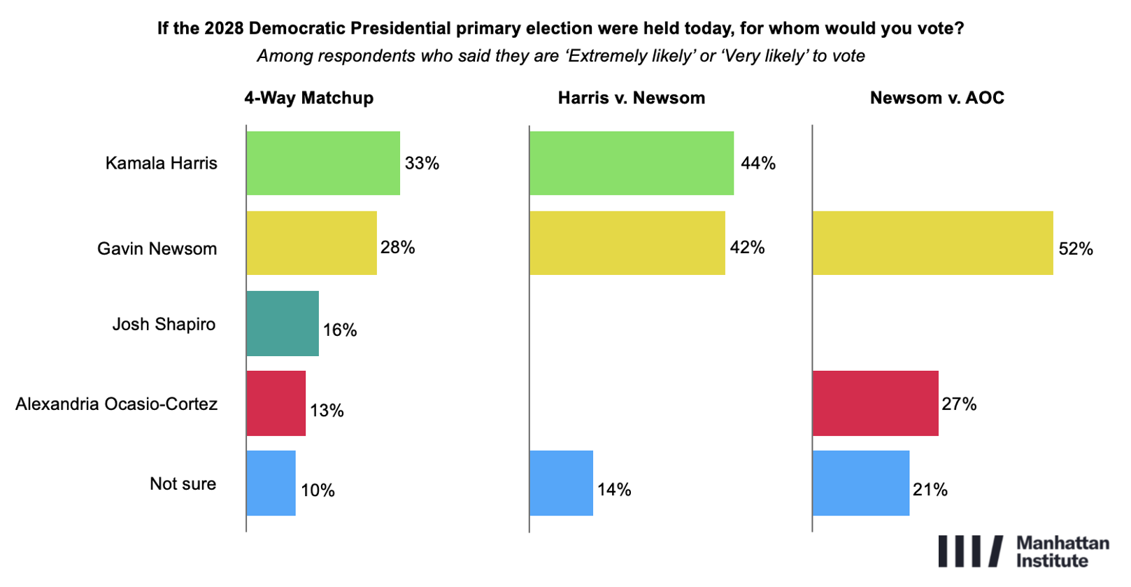 When testing a narrower field, Harris remains the top-performer—albeit by a relatively slim margin. In a four-way matchup with Newsom, AOC, and Shapiro, Harris leads (33%), followed by Newsom (28%), Shapiro (16%), and AOC (13%). A two-way Harris–Newsom contest is essentially tied (44% to 42%), but in a Newsom–AOC matchup, Newsom prevails decisively, defeating AOC by 25 points.