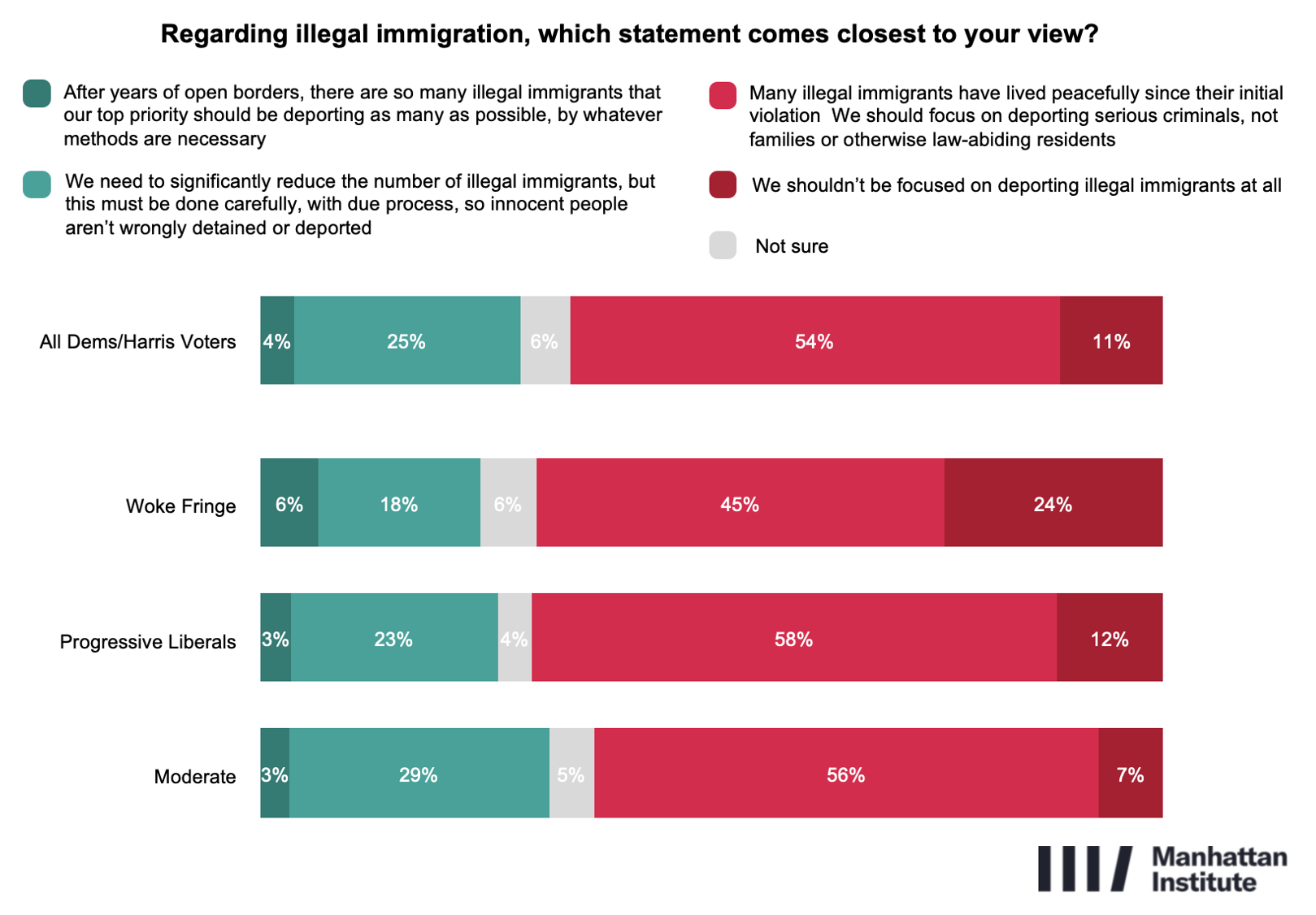Democratic voters prefer a more pragmatic approach to immigration enforcement than what is often presented by “Open Borders” advocates. Only 11% say there should be no focus on deporting illegal immigrants whatsoever. A majority (54%) favor focusing on the deportation of criminal illegal immigrants rather than families and otherwise law-abiding residents, and an additional 25% support reducing the number of illegal migrants carefully through due process. Just 4% endorse deportation by any means necessary. Even within the Woke Fringe, only one in four favors taking no enforcement action.