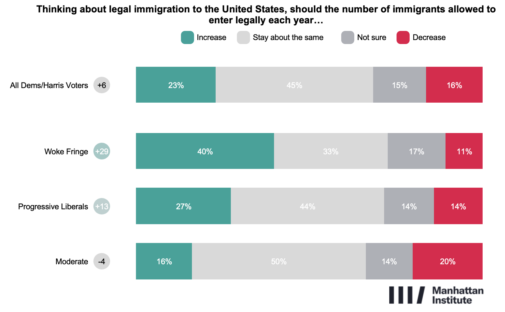 On legal immigration, the Democratic coalition broadly favors a merit-based approach. Nearly two-thirds (65%) say the legal immigration system should put more priority on skills, education, and work experience. A plurality also supports leaving current immigration levels unchanged (45%), while 23% favor increasing admissions and 16% support decreasing them. The Woke Fringe stands apart, with 40% favoring an increase—notably higher than among Progressive Liberals (27%) and Moderates (16%).