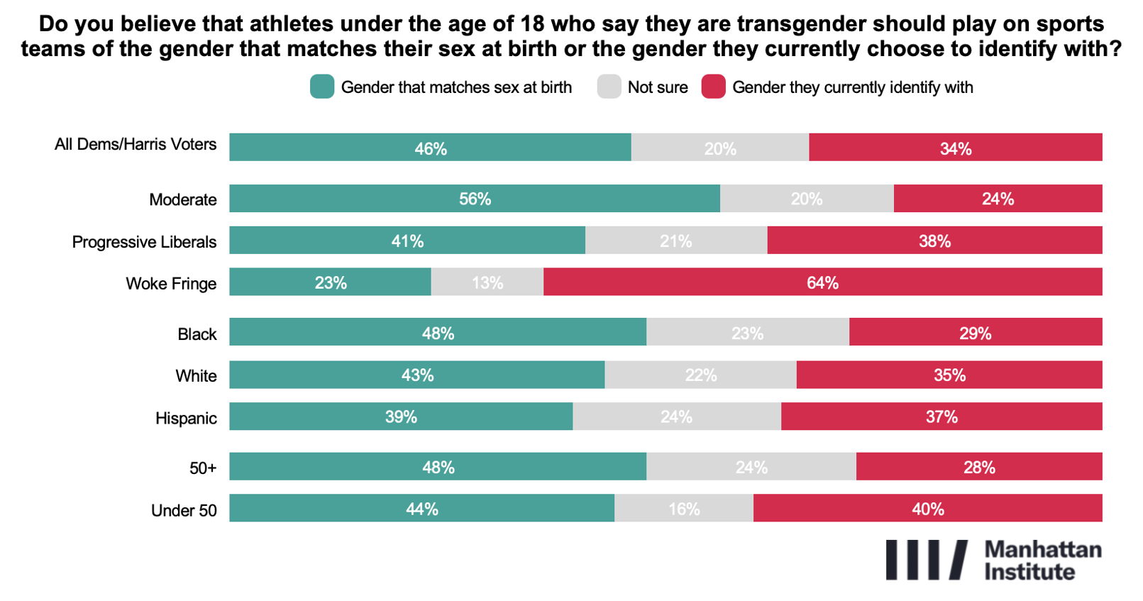 On this issue, the Woke Fringe consistently holds more permissive views than the broader coalition. Nearly two-thirds (64%) say young athletes should compete based on current chosen gender identity, 32% support allowing minors under 18 to medically transition, and 44% oppose mandatory parental notification for transitions in schools.