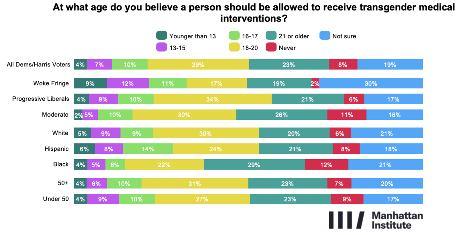 Attitudes toward transgender medical interventions are similarly restrictive. A majority (52%) believe individuals should be at least 18 to receive gender-related medical interventions, and 23% favor a minimum age of 21. Only 4% say children under 13 should be eligible for medical transition, rising to 11% for those under 16. Nearly one-in-ten (8%) voters in today’s Democratic coalition believe that transgender medical interventions should never be allowed—even for adults.