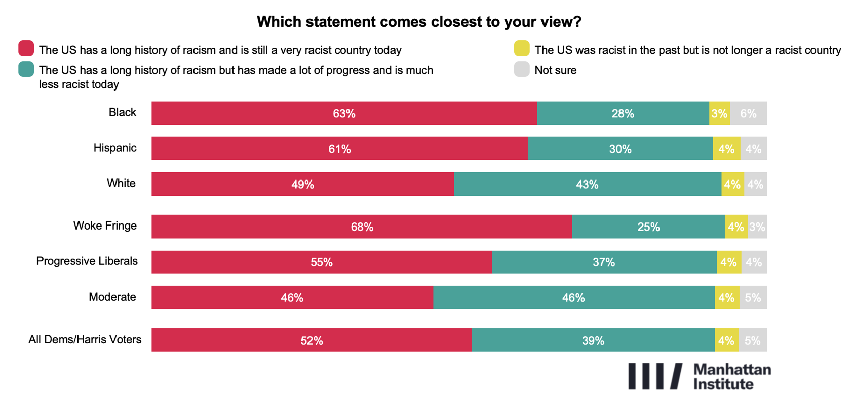 These attitudes are relatively consistent across demographic groups, though intensity varies by faction. Nearly half of Moderates (46%) say the country remains very racist, compared with 55% of Progressive Liberals and 68% of the Woke Fringe. Racial differences are also evident: 49% of white voters say the country remains very racist, compared with 61% of Hispanic and 63% of black voters.