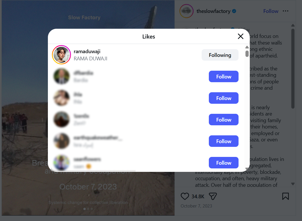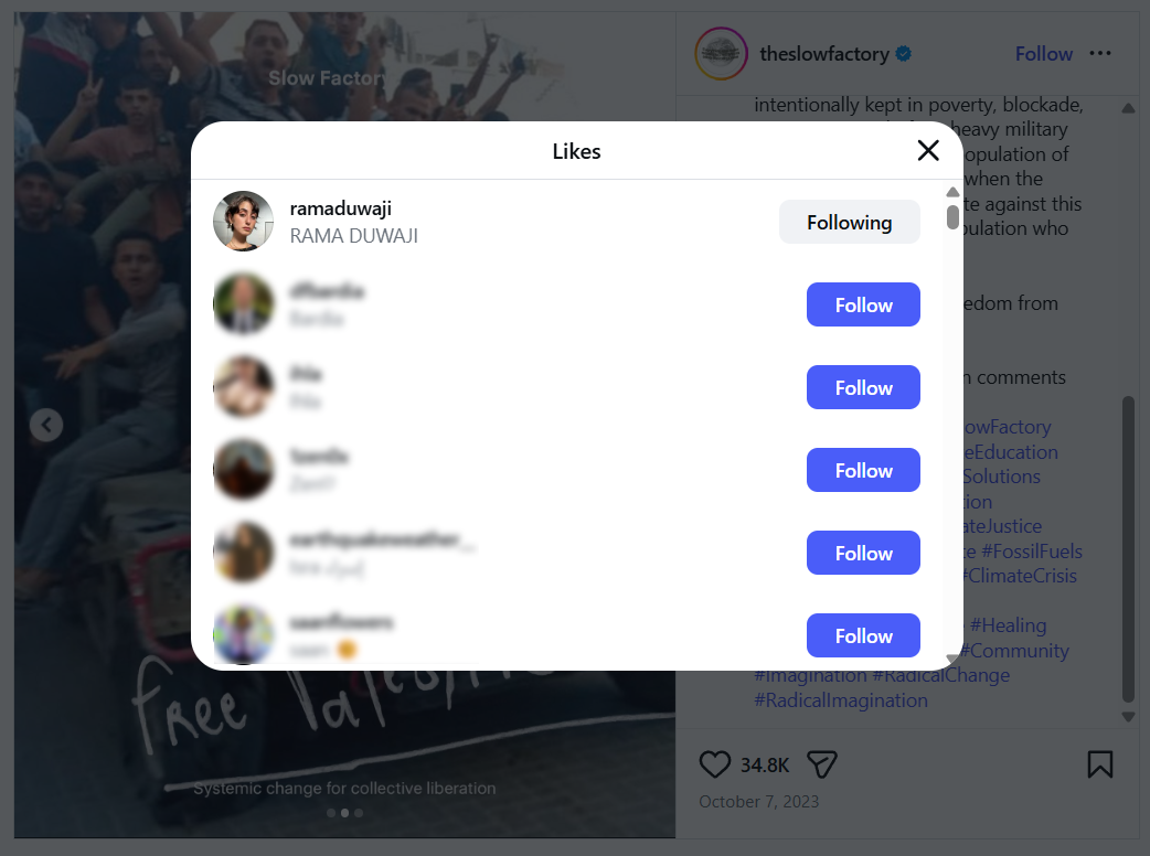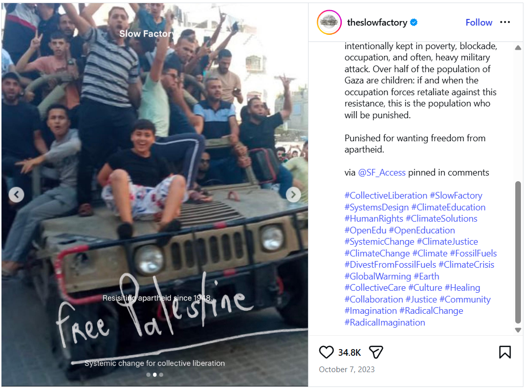 The first post, shared on the day of Hamas’ onslaught, came from The Slow Factory, which bills itself as “a school, knowledge partner and climate innovation organization” that “center[s] the voices and ideas of the Global Majority (Black, Indigenous, and other people of color) to share their knowledge outside the boundaries of institutions & oppressive systems.”