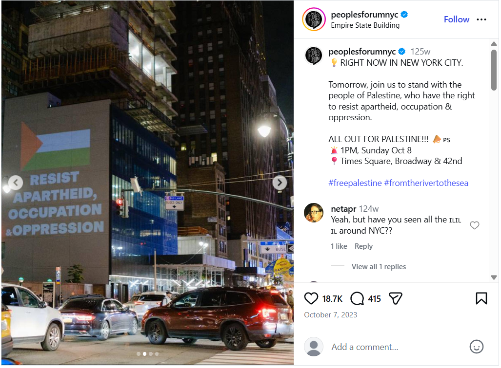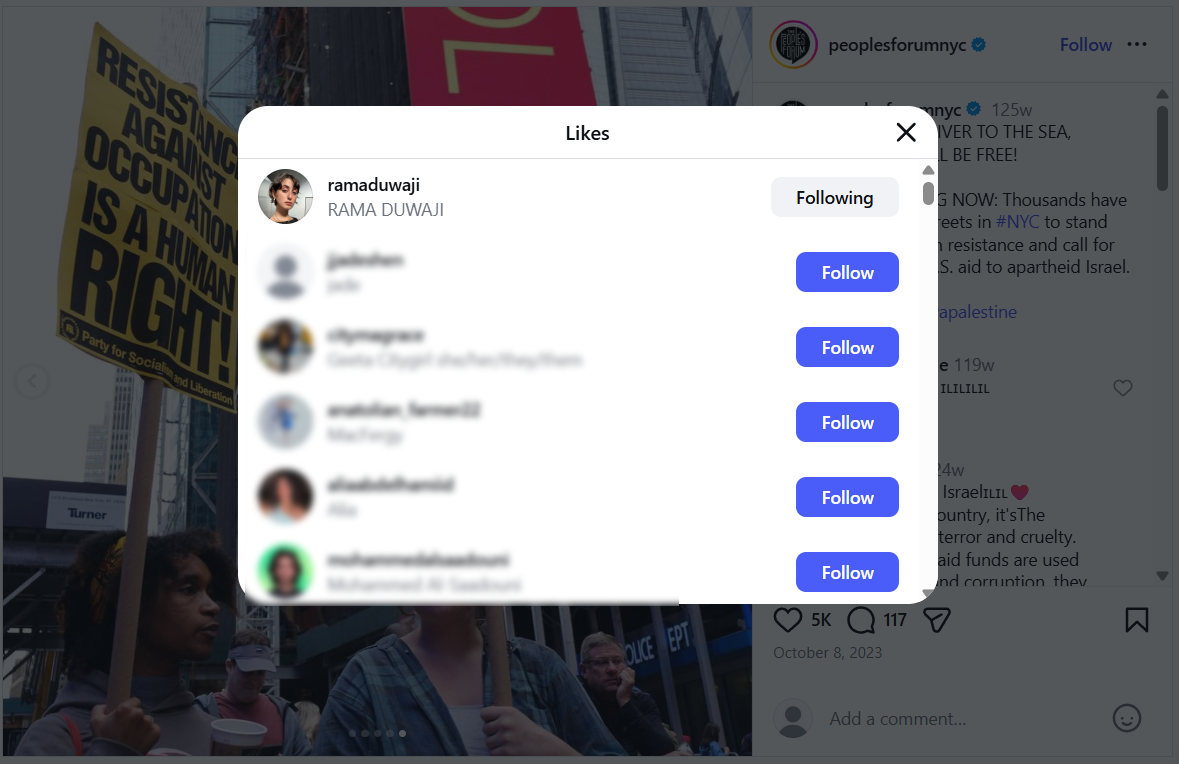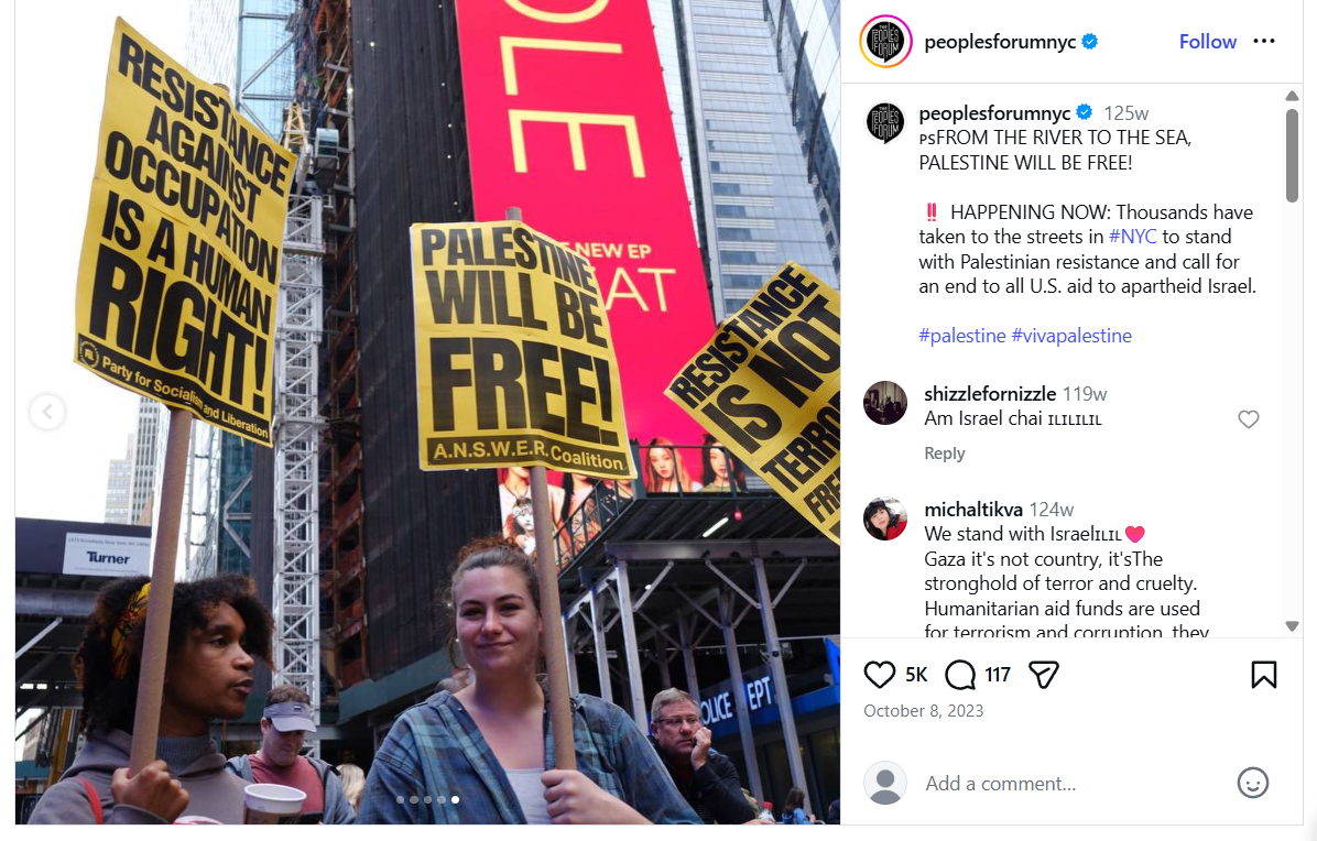 It is unclear when Duwaji liked the Slow Factory post, or the materials that the People’s Forum — part of Shanghai-based Maoist tech mogul Neville “Roy” Singham’s network of nonprofits promoting pro-China, pro-Russia and pro-Iran propaganda — posted to Instagram on Oct. 8, 2023. Duwaji, again using her personal account, liked two posts from protests the organization led alongside the Democratic Socialists of America and allied organizations in Times Square one day after the attack on Israel.