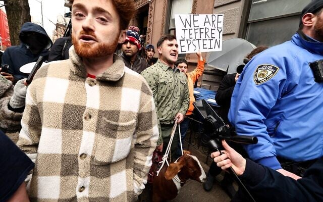 Far-right influencer Jake Lang holds a goat on a leash during a protest organized by Lang against alleged ‘Islamification’ in front of Gracie Mansion, New York Mayor Zohran Mamdani’s official residence, in New York, March 7, 2026. (CHARLY TRIBALLEAU / AFP)