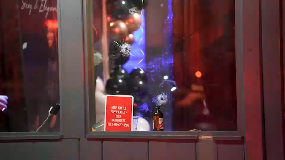 Video captures responding officers on scene canvassing the crime scene and nearby area following the shooting. Bullet holes were observed on one of the windows of the venue.