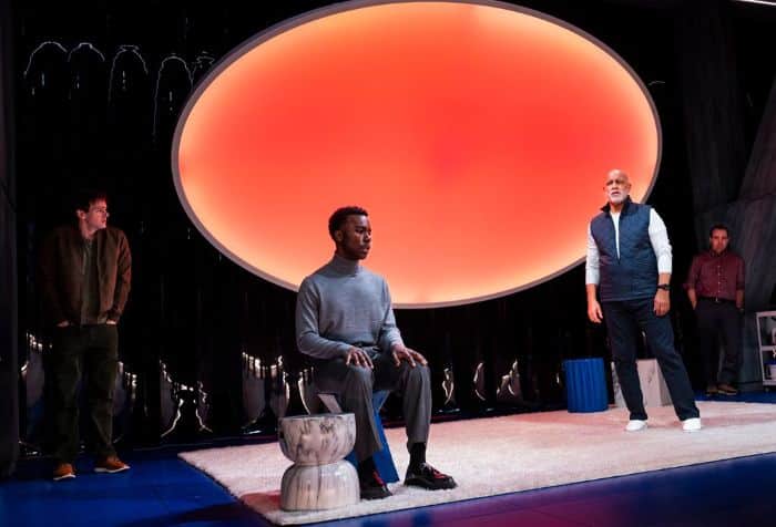 Under the incisive direction of Michael Herwitz, a compelling cast of four delivers the driven personalities, their goals, evolving interconnections, and ultimate decisions with calculated benefits, as they meet, clash, agree to move forward, and, in so doing, uncover some shocking truths that lead to an even more shocking conclusion, with comic touches along the way to lighten the intensity. Michael Genet is the impatient and imperious 64-year-old billionaire Zeit Smith, who is becoming increasingly aware of his approaching mortality, is determined to live forever, and bankrolls the project to make that happen, enlisting the leading researchers in the field to conduct the experimental procedure that will reverse aging and increase longevity. Jonny-James Kajoba is Ivan Shelley, Zeit’s English-born-and-raised professional assistant in his early twenties, whose mother (unseen in the show but about whom we will learn much more as the story progresses) encouraged him to apply for the high-status position in uptown Manhattan, and who is aided in his dedicated work by the essential omnipresent AI technology they call George (heard in the format of voiceovers from Ivan’s and Zeit’s digital devices).