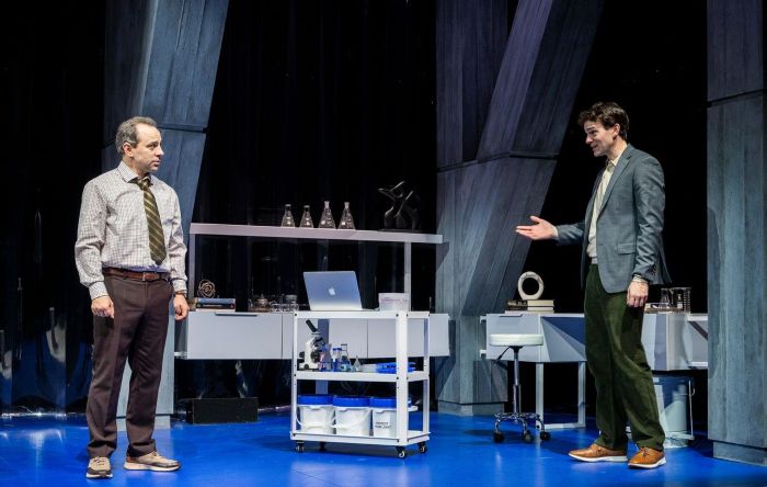 Following an extensive investigation into their work and backgrounds, they have invited Professor Chris Coffey, portrayed by Rob McClure, and his graduate student assistant at Columbia University, Jeffrey Jordan, played by Matt Walker, to discuss the plan and to make them an extremely lucrative offer that would not only pay them exorbitant salaries but also fund their research, after failing to secure grants. The professor is hesitant to undertake the project, which is in defiance of existing regulations and years in advance of its readiness to be performed on human subjects (thus far working largely with worms), as he describes in specific scientific terminology that is incomprehensible to Zeit (in addition to being a playwright, Glass is also an M.D., educator, and researcher, with a specialization in the process of aging), clarified in more easily understood language by Jeff (Walker, too has a combined education in theater from Julliard, neurobiology from Harvard, and a Ph.D. in genetics from Columbia), who is enthusiastic about the possibilities of advancement – and the money. Zeit is impressed with the young research scholar, and ready to dismiss his principled professor, until Jeff convinces him that his advisor, from whom he is learning, is needed for the experiment to succeed.