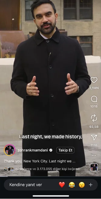 Figure 6 – Mamdani’s Victory Post https://www.instagram.com/reel/DQrrenCDtrg/?igsh=ZGZpanBkYjFidWts