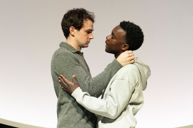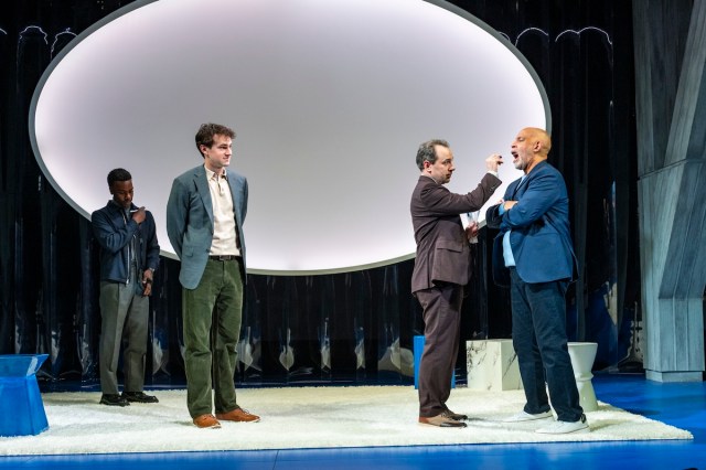 But it’s the live performances that really leave an impression: One of the theater’s irrepressible nice guys, McClure excels in the role of the mild-mannered and unflappably ethical Coffey, and he delights the audience with a brief turn as a kind of Ivy League Maury Povich (oh yes, there are blood tests). Kajoba is particularly moving as a man navigating a crisis of faith and conscience after discovering that most of what he thought he knew about his life was a lie. While Ivan’s attraction to Jeffrey feels genuine (this gay romantic subplot is both shoehorned and ho-hum, a tepid rivalry), the enigmatic Walker keeps us speculating about his character’s intentions long after the final bow. Is this love, or just a very aggressive form of networking?