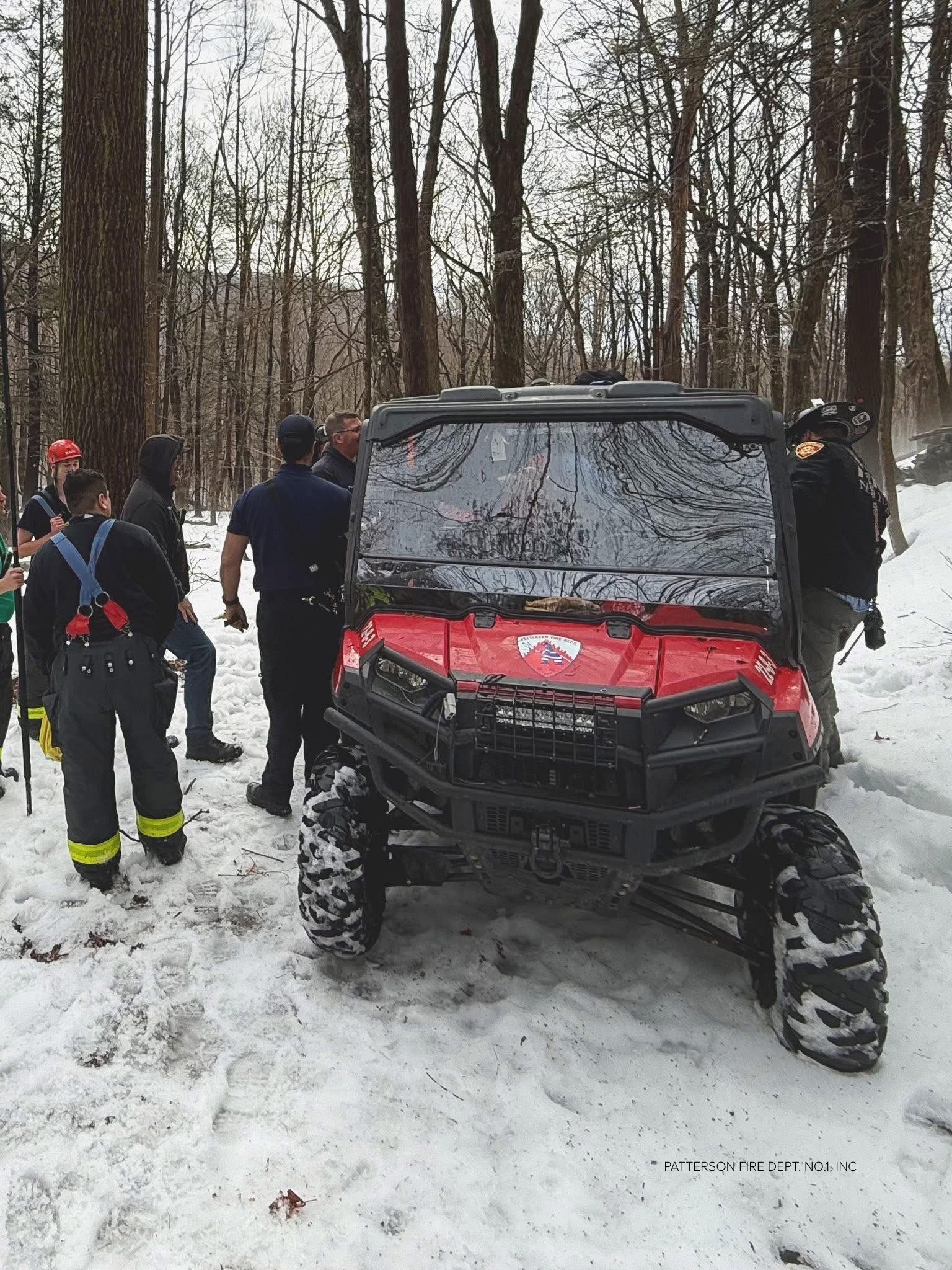 Aware of poor conditions and the mile-long icy trek that awaited them, Patterson rescue workers arrived to the park with a utility task vehicle (UTV).