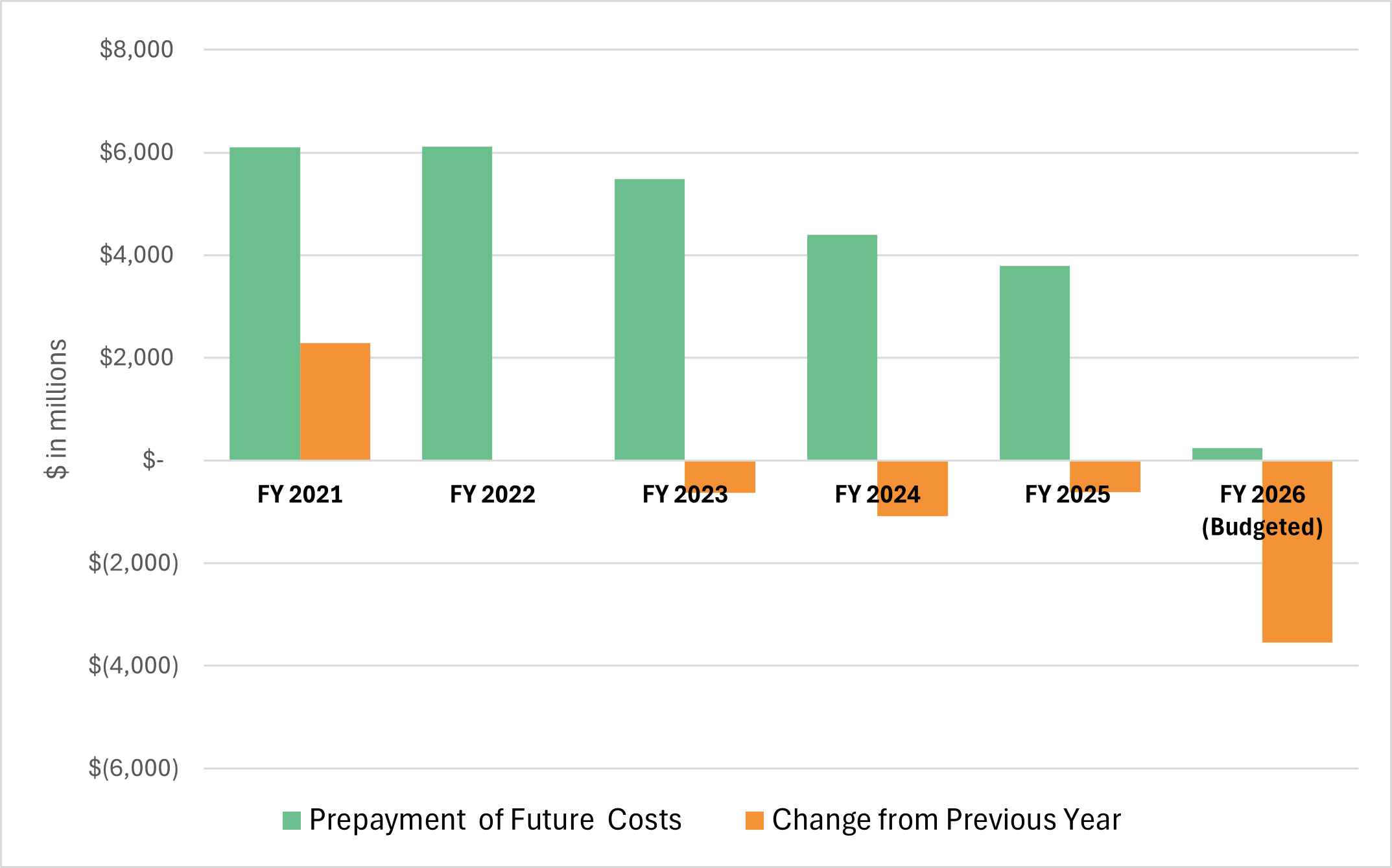 In FY25, the City carried forward $3.8 billion in prepaid expenses. Under the Mayor’s plan, that drops to just $238 million for FY26—a 94% decline.