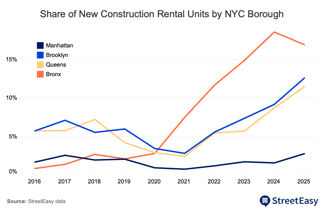 In 2025, one in five new rentals in the Bronx was new construction, the highest in NYC. In Brooklyn and Queens, 12.6 percent and 11.5 percent of rentals were new construction.