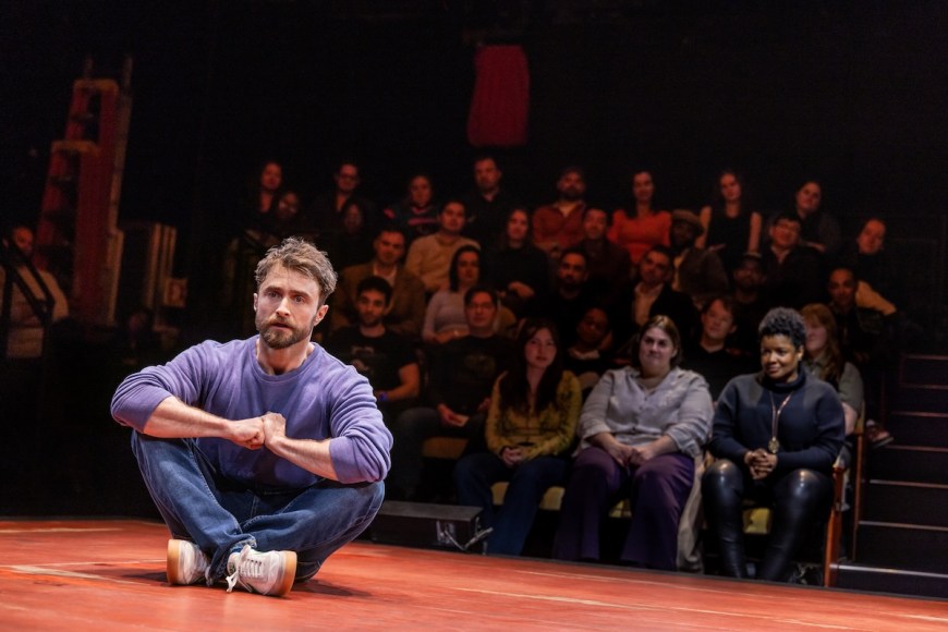 The creative team led by directors Jeremy Herrin and Duncan Macmillan (who is also the chief playwright) does what they can to compensate for the large house, putting audience seats on either side of the stage, and placing the main theatergoer-participants in them. At the same time, Radcliffe makes sure to go up beyond the orchestra seats to recruit volunteers who will read out loud. But this very effort at inclusion means a reliance on regular theatergoers sitting in all three tiers to deliver their lines audibly; even people sitting close to the stage told me they couldn’t decipher much that was shouted out.