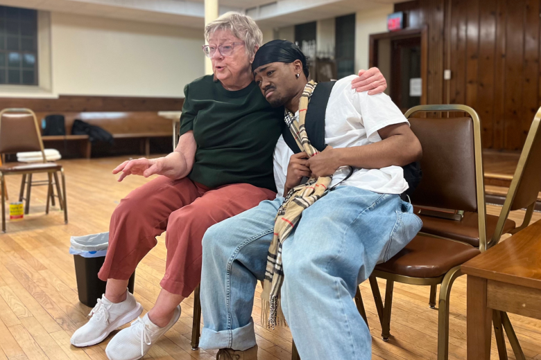 Mary Gant playing Davia wraps their arm around King Jackson playing Jesús during a rehearsal for the play “Abuelita.” Credit: Courtesy PRIME Productions