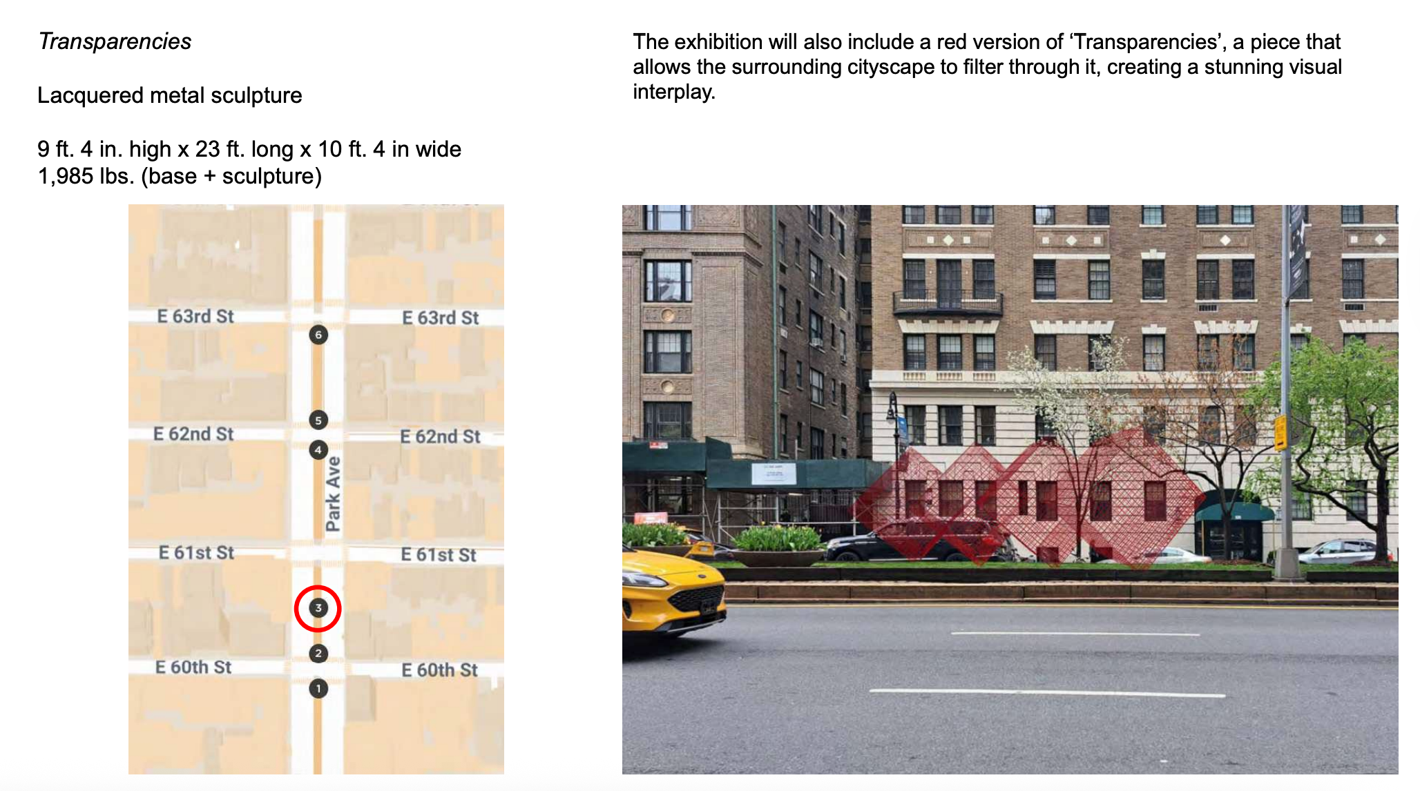 The artist will also have several colored cubes made out of metal latticework, including a 23-foot-long red piece called “Transparencies” on Park Avenue between East 60th and East 61st streets.