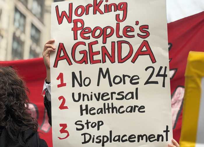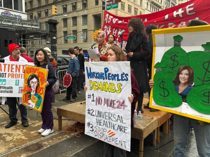 “This must end now,” the protester continued. “We all deserve healthcare regardless of where and what hours we work. We call on all working people not only to condemn Kathy Hochul and Adrienne Adams, but to unite against the destruction of our health under these crushing policies.”