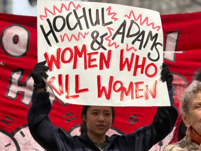 Protesters called on voters to reject Hochul and Adams in the governor’s race, claiming they do not protect women’s or worker’s rights.Photo by Renee DeLorenzo