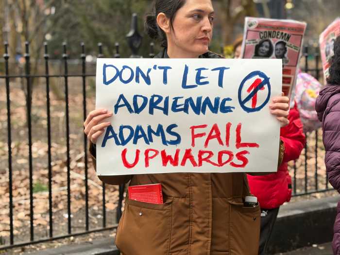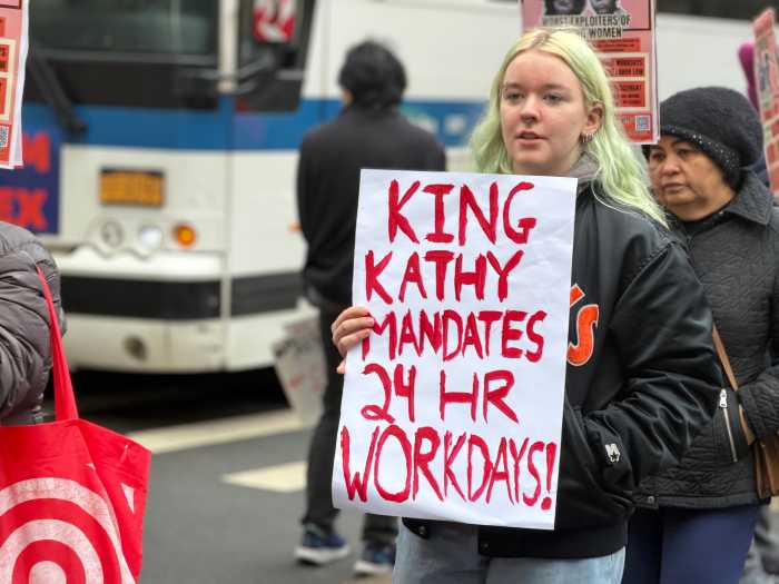 The crowd of protesters held signs claiming Hochul and Adams have perpetuated the 24-hour work day.Photo by Renee DeLorenzo
