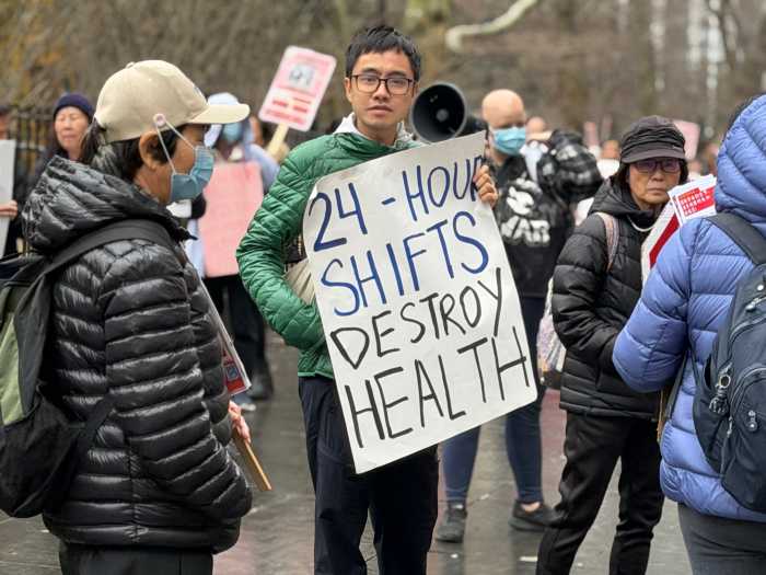 “The 24-hour workday is a chronic murder of hundreds of women,” a protester said, who called it a modern-day slavery system. “Everyone acknowledges that the 24-hour shift is wrong and inhumane. When workers are brutalized, our patients can’t get the good quality care they need.”