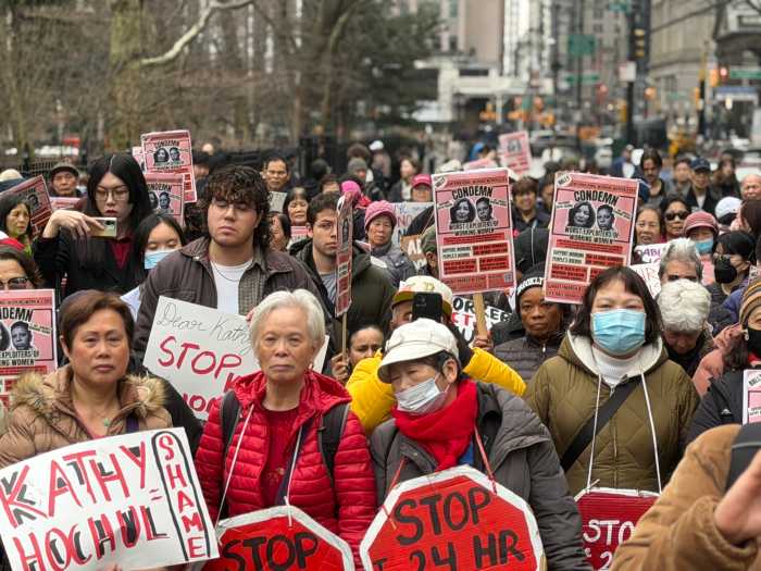 Protesters and labor unions from Queens and across New York City rallied near City Hall on March 8, International Women’s Day, demanding the City Council stop delaying the passage of the No More 24 Act, which would ban the 24-hour workday that disproportionately impacts women working in home health care.