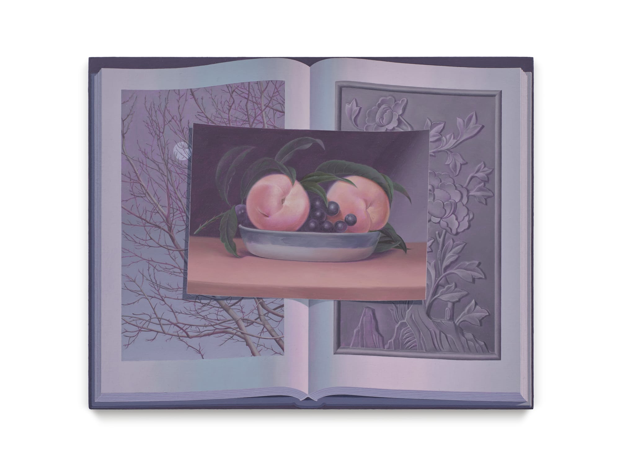Olivia Jia’s “Night reading (Peale’s peaches, moon through the trees, relief carving from a garden doorway)” (2025) (image courtesy Esther III)