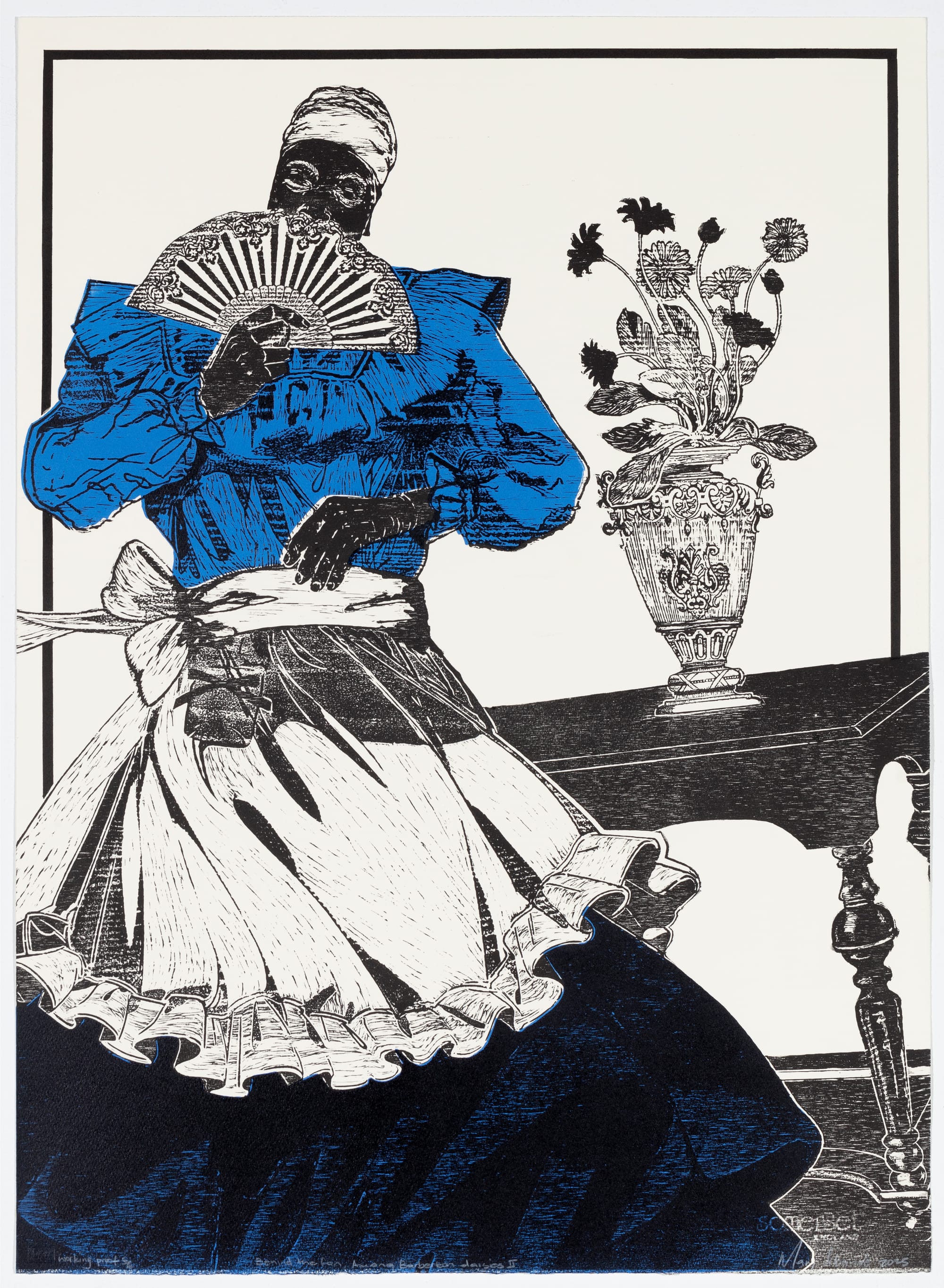 Mary Sibande’s (2025) “Behind The Fan, Among Barberton Daisies II, woodcut 6” presented by David Krut Arts (image courtesy Powerhouse Arts)